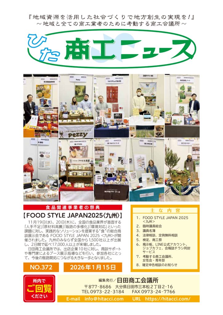 商工ニュース 2026年1月15日発行 372号 バックナンバー ・2025年11月15日発行 371号 ・2025年9月15日発行 370号 ・2025年7月15日発行 369号 ・2025年5月15日発行 368号 ・2025年3月15日発行 367号 ・2025年1月1日発行 366号 ・2024年11月15日発行 365号 ・2024年9月15日発行 364号 ・2024年7月15日発行 363号 ・2024年5月15日発行 362号 お申し込みはこちら