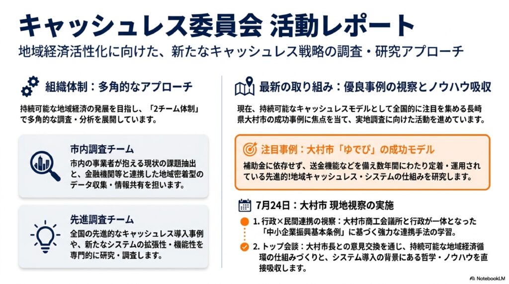 また官民連携による地域経済活性化(中小企業振興基本条例の活用)や、デジタル地域通貨「ゆでぴ」の成功事例を現地で直接学ぶため、本年7月24日に大村市(長崎県)へ行政・商工会議所合同での視察を行う計画を承認いたしました